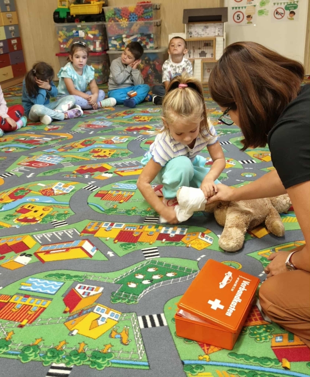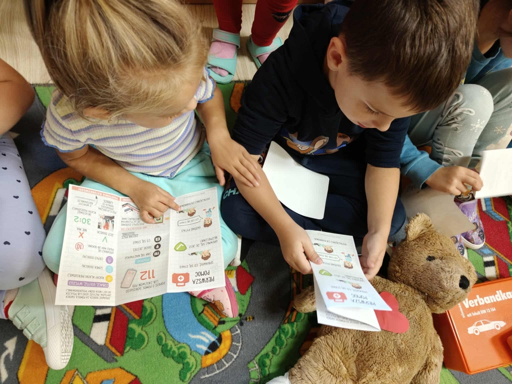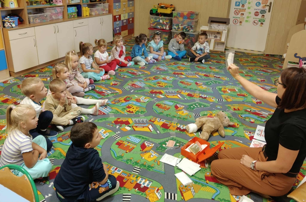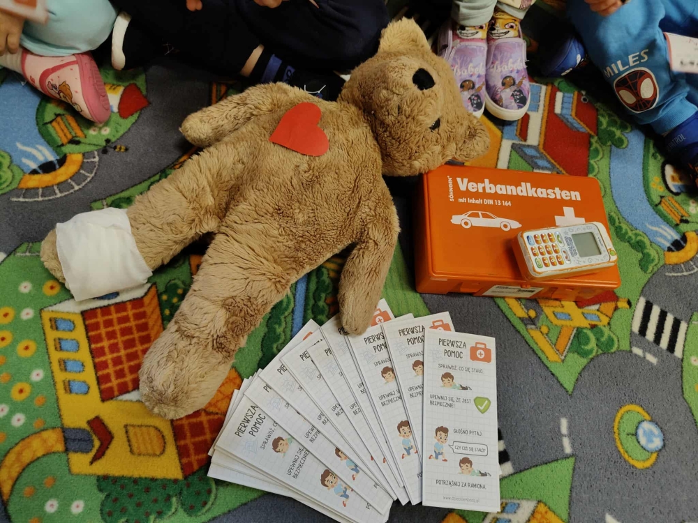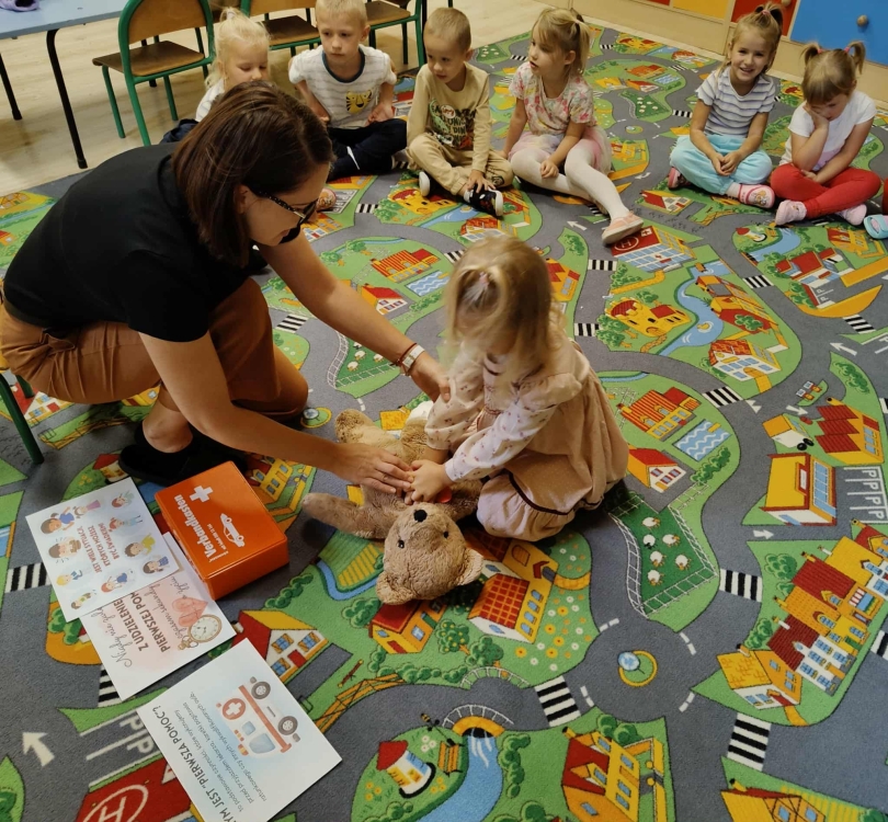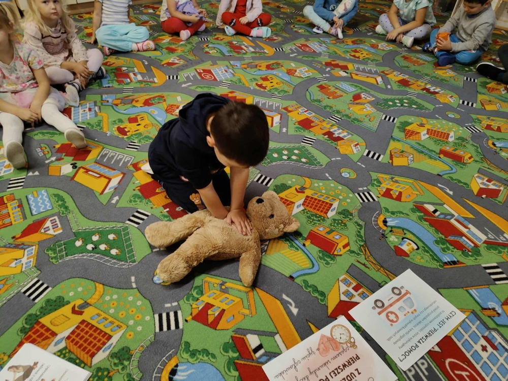 W dniu 16 września w oddziale przedszkolny obchodziliśmy Światowy Dzień Pierwszej Pomocy. Przedszkolaki zapoznały się z pojęciem "pierwsza pomoc”, specyfiką pracy ratownika medycznego, przypomniały sobie numer alarmowy, dowiedziały się w jaki sposób można komuś pomóc zanim przyjedzie pogotowie ratunkowe. Z uwagą przyglądały się zawartości apteczki i pokazowi przeprowadzenia masażu serca. Dzieci same również mogły spróbować udzielić pierwszej pomocy Misiowi Krzysiowi. Zajęcia zakończyły się utrwaleniem numeru ratunkowego oraz rozdaniem pamiątkowych dyplomów i ulotek dotyczących pierwszej pomocy.